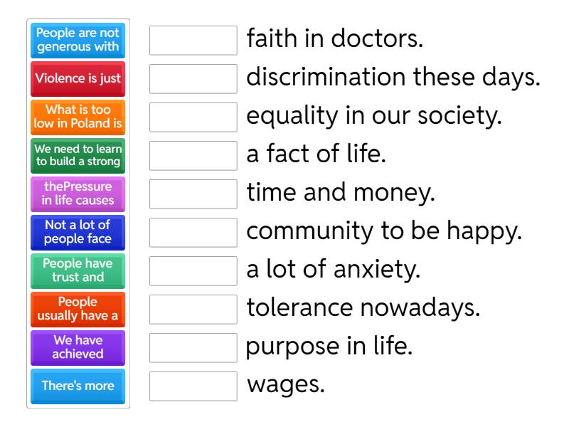 We need to learn to build a strong - community to be happy., thePressure in life causes - a lot of anxiety., What is too low in Poland is - wages., People are not generous with - time and money., People usually have a  - purpose in life., We have achieved - equality in our society., Not a lot of people face - discrimination these days., People have trust and  - faith in doctors., Violence is just - a fact of life., There's more - tolerance nowadays.,