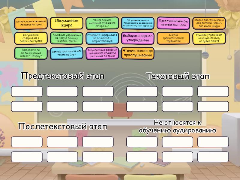 Предтекстовый этап: Обсуждение темы и предсказание содержания по заголовку или картинке, Активизация ключевой лексики по теме, Актуализация фоновых знаний (что студенты уже знают по теме), Обсуждение жанра, Снятие грамматических трудностей, Языковые упражнения на новую лексику из аудио-текста, Текстовый этап : Разделите информацию на основную и второстепенную , Выберете верное утверждение , Второе прослушивание для деталей (запись дат, имён, цифр), Послетекстовый этап : Обсуждение содержания в парах или группе, "Какая эмоция выражает отношения автора к...." , Разделяете ли вы точку зрения автора? Почему? , Не относятся к обучению аудированию: Речевые упражнения на новую лексику из аудио-текста, Чтение текста до прослушивания, Запись прослушанного текста на слух, Прослушивание без постановки цели,