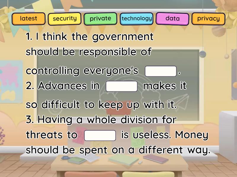 1. I think the government should be responsible of controlling everyone's ____. 2. Advances in ____ makes it so difficult to keep up with it. 3. Having a whole division for threats to ____ is useless. Money should be spent on a different way. 4. All internet-____ ____ are useful somehow. There should stay like that forever! 5. Protecting your ____ is easy. Breaches of it rarely occur. 6. Accessing wireless ____ in restaurants is completely safe. I don't have a problem with doing it.