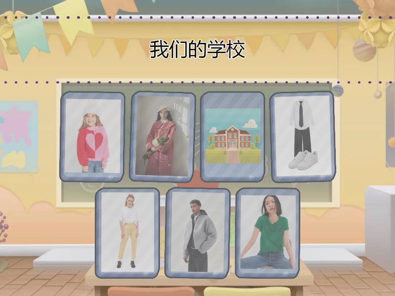 我们的学校 , 学校的校服 , 黄色的牛裤子 , 绿色的汗衫 , 灰色外套 , 粉红色和红色的毛衣 , 红色的大衣 ,