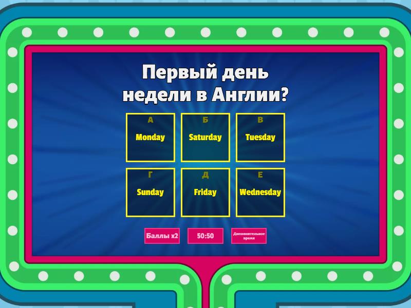 1) Первый день недели в Англии? a) Monday b) Saturday c) Tuesday d) Sunday e) Friday f) Wednesday 2) Нам давали на обед помидоры цвета... a) Orange b) Blue c) Red d) Pink e) Green f) Violet 3) Он и она - это  a) They b) He c) It d) I e) We f) You 4) Какой из месяцев самый короткий? a) March b) October c) August d) July e) December f) February 5) Мама, папа, я - вместе дружная... a) Children b) Family c) Parents d) Father e) Uncle f) Grandmother 6) What animal is it? a) Shark b) Goose c) Lion d) Cat e) Bear f) Frog 7) Каждый день её вы пьёте, утоляет жажду… a) Coffee b) Tea c) Water d) Milk e) Juice f) Cola 8) A flower is... a) blue b) black c) yellow d) orange e) green f) brown 9) Кто тушит пожары? a) Builder  b) Postman  c) Pilot d) Fireman  e) Doctor f) Teacher  10) Множественное число слова child a) childs b) childrens c) children 11) What is it? a) Биг Бен b) Эйфелева башня c) Кремль d) Статуя Свободы 12) Столица Великобритании a) Париж b) Вашингтон c) Лондон d) Стамбул 13) Какая буква лишняя a) Bb b) Ee c) Gg d) Ff e) Dd f) Cc 14) Как звучит вопрос: "Как у тебя дела? a) What is your name? b) How old are you? c) How are you? d) Where do you live?