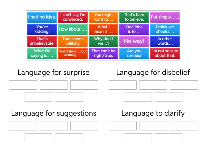 Language for surprise: Are you serious?, That’s unbelievable!, You’re kidding!, No way!, I had no idea., Language for disbelief: That seems unlikely., That’s hard to believe., I can’t say I’m convinced., That can’t be right/true., I’m not so sure about that., Language for suggestions: Why don’t we…?, I think we should…., You might want to…., How about …., One idea is to …, Language to clarify: You’d think…..but actually …., In other words…, Put simply, ….., What I’m saying is …., What I mean is ….,