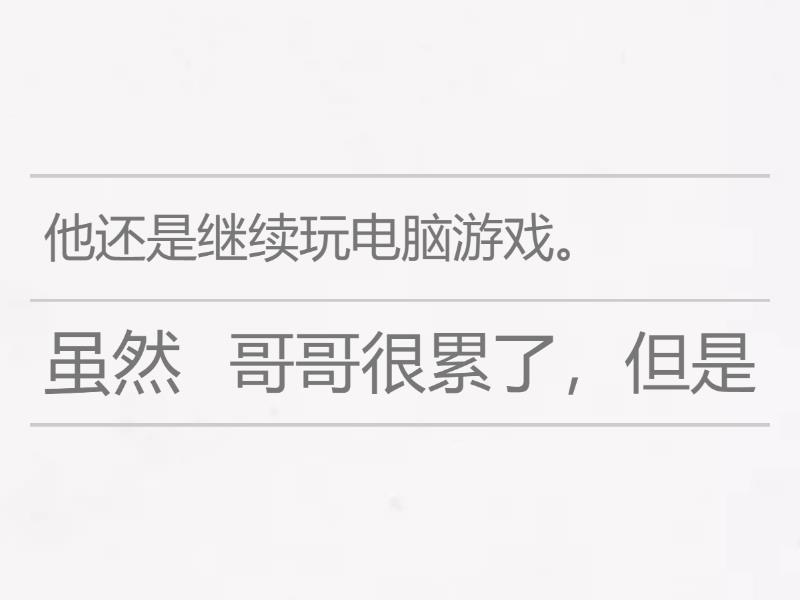 虽然 哥哥很累了,但是 他还是继续玩电脑游戏。, 虽然 这道题目很难,但是 明华会回答。, 虽然 爸爸生病了, 但是 还是去上班。, 虽然 文强跌倒了,但是 还是坚持跑到终点。, 虽然 小丽唱得不是很好听,但是 大家还是热烈地拍手。,