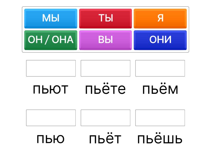 Я - пью, ТЫ - пьёшь, ОН / ОНА - пьёт, МЫ - пьём, ВЫ - пьёте, ОНИ - пьют,