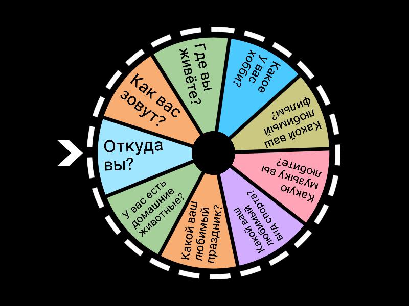 1) Как вас зовут? 2) Где вы живёте? 3) Какое у вас хобби? 4) Какой ваш любимый фильм? 5) Какую музыку вы любите? 6) Какой ваш любимый вид спорта? 7) Какой ваш любимый праздник? 8) У вас есть домашние животные? 9) Откуда вы?