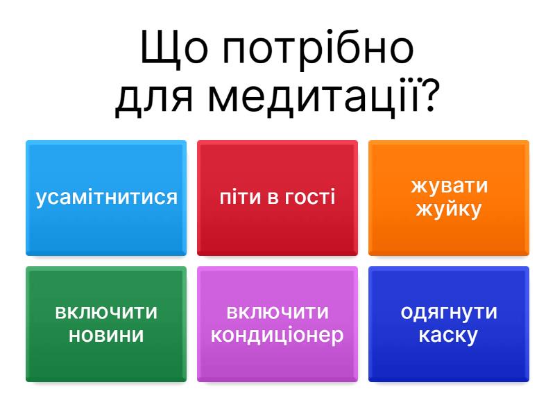 1) Що потрібно для медитації? a) усамітнитися b) піти в гості c) жувати жуйку d) включити новини e) включити кондиціонер f) одягнути каску 2) Що потрібно для швидкого засинання? a) прийняти теплу ванну b) одягнути лижі c) посваритися з сусідом d) випити горілку e) положити поруч гантелю f) включити фільм жахів 3) Що потрібно для схуднення? a) виключити цукор b) їсти піцу c) більше пити кави d) пити лимонад e) читати книги f) лежати на дивані