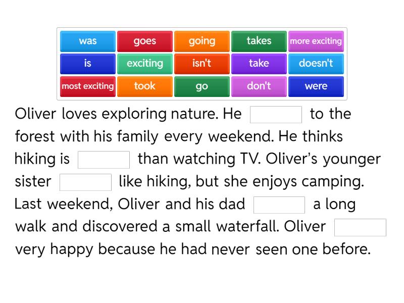 Oliver loves exploring nature. He ____ to the forest with his family every weekend. He thinks hiking is ____ than watching TV. Oliver’s younger sister ____ like hiking, but she enjoys camping. Last weekend, Oliver and his dad ____ a long walk and discovered a small waterfall. Oliver ____ very happy because he had never seen one before. Michael loves sports. He ____ basketball every Saturday. He thinks playing basketball is ____ than watching TV. His brother ____ play basketball, but he prefers football. Last week, Michael’s parents ____ him a new basketball. He ____ very happy because he wanted a new ball for a long time. Ben loves riding his bicycle. He ____ in the park every weekend. He thinks cycling is ____ than walking. Ben’s little sister ____ ride a bike yet, but she wants to learn. Ben’s parents ____ him a new helmet last week. He ____ very happy because the helmet is his favorite color, blue.