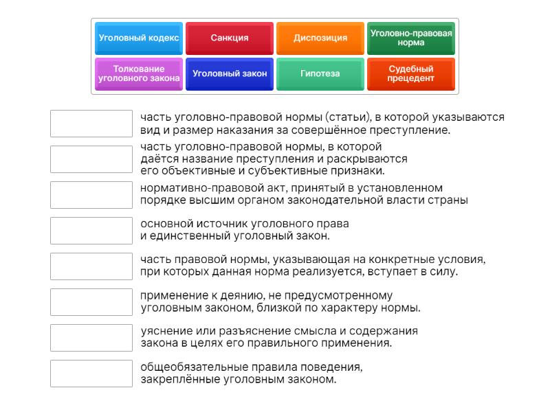 Уголовный закон - нормативно-правовой акт, принятый в установленном порядке высшим органом законодательной власти страны, Уголовный кодекс - основной источник уголовного права и единственный уголовный закон., Уголовно-правовая норма - общеобязательные правила поведения, закреплённые уголовным законом., Толкование уголовного закона - уяснение или разъяснение смысла и содержания закона в целях его правильного применения., Судебный прецедент - применение к деянию, не предусмотренному уголовным законом, близкой по характеру нормы., Гипотеза - часть правовой нормы, указывающая на конкретные условия, при которых данная норма реализуется, вступает в силу., Диспозиция - часть уголовно-правовой нормы, в которой даётся название преступления и раскрываются его объективные и субъективные признаки., Санкция - часть уголовно-правовой нормы (статьи), в которой указываются вид и размер наказания за совершённое преступление.,