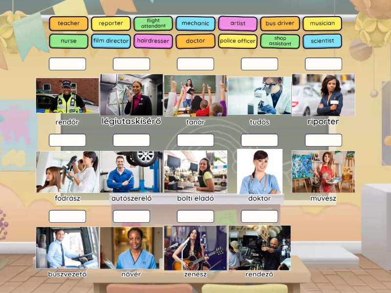 bus driver - buszvezető, doctor - doktor, musician - zenész, teacher - tanár, nurse - nővér, scientist - tudós, shop assistant - bolti eladó, flight attendant - légiutaskísérő, police officer - rendőr, hairdresser - fodrász, reporter - riporter, mechanic - autószerelő, film director - rendező, artist - művész,