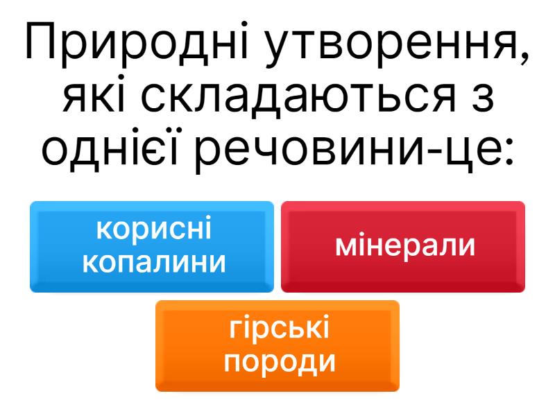 1) Природні утворення, які складаються з однієї речовини-це: a) корисні копалини b) мінерали c) гірські породи 2) Природні тіла, що складаються з декількох мінералів або скупчення одного у великій кількості в земній корі-це: a) гірські породи b) корисні копалини c) каміння 3) Які гірські породи утворюються під дією температури повітря, води й інших процесів, що відбуваються на поверхні Землі та у водоймах? a) магматичні b) осадові c) метаморфічні 4) Які гірські породи утворюються під дією високого тиску та температури? a) магматичні b) осадові c) метаморфічні 5) Які гірські породи утворюються з магми під час виверження вулканів? a) магматичні b) осадові c) метаморфічні 6) До осадових гірських порід належать: a) сіль b) граніт c) базальт d) крейда 7) До найбільш найпоширеніших на Землі магматичних гірських порід належить: a) пемза b) вулканічний туф c) граніт 8) Мінерали та гірські породи, які людина широко використовує, наприклад, як паливо, будівельні матеріали, хімічну сировину, для одержання кольорових і чорних металів називаються..... a) Природними компонентами b) Корисними копалинами c) Земними покладами d) Підземними рудами 9) За походженням гірські породи поділяються на.... a) магматичні, осадові, метаморфічні b) метаморфічні, осадові, паливні c) осадові, рудні, магматичні d) паливні, рудні, нерудні 10) Ця корисна копалина утворилась багато мільйонів року тому з відмерлих дерев, а схожа до неї утворюється і зараз у регіонах з надмірним зволоженням і вологолюбною рослинністю. a) Кам′яна сіль, вапняк b) Кам′яне вугілля, торф c) Мідь, золото