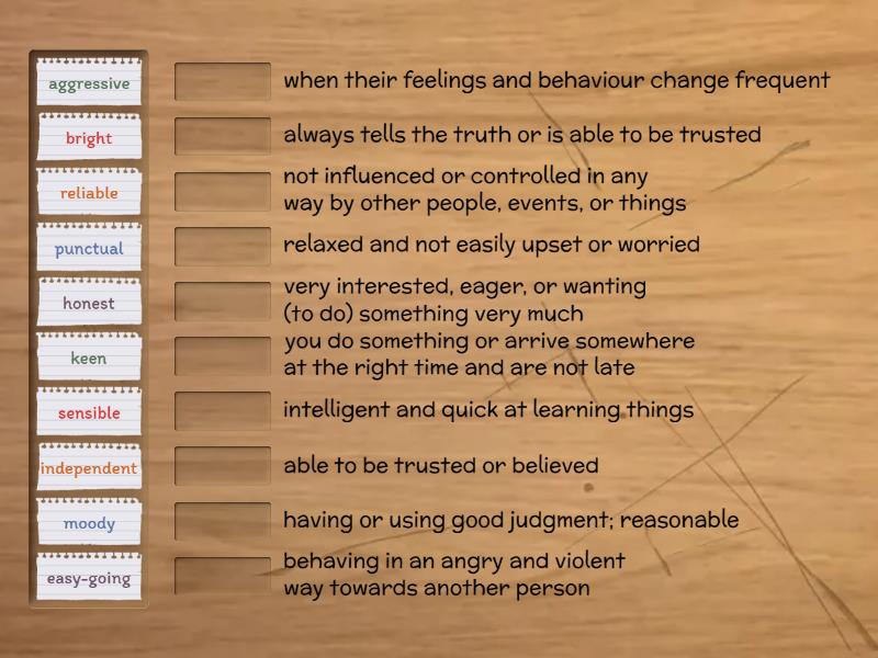 reliable - able to be trusted or believed, sensible - having or using good judgment; reasonable, easy-going - relaxed and not easily upset or worried, aggressive - behaving in an angry and violent way towards another person, bright - intelligent and quick at learning things, honest - always tells the truth or is able to be trusted, keen  - very interested, eager, or wanting (to do) something very much, punctual - you do something or arrive somewhere at the right time and are not late, moody - when their feelings and behaviour change frequent, independent - not influenced or controlled in any way by other people, events, or things,