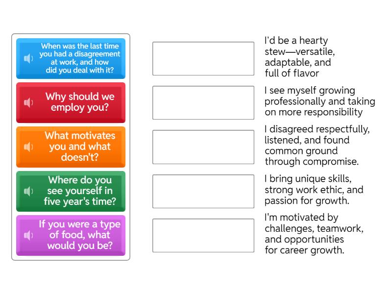 Where do you see yourself in five year's time? - I see myself growing professionally and taking on more responsibility, What motivates you and what doesn't? - I'm motivated by challenges, teamwork, and opportunities for career growth., Why should we employ you? - I bring unique skills, strong work ethic, and passion for growth., When was the last time you had a disagreement at work, and how did you deal with it? - I disagreed respectfully, listened, and found common ground through compromise., If you were a type of food, what would you be? - I’d be a hearty stew—versatile, adaptable, and full of flavor,