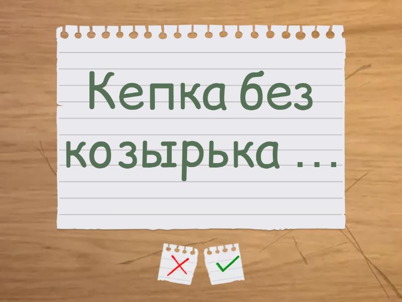 Стул без спинки … - табурет, Чашка без ручки … - стакан, Кепка без козырька … - шапка, Кофта без рукавов … - жилет, Снеговик без холода … - вода, Всадник без лошади - пешеход, Мороженое без холодильника - напиток, коктейль, Дерево без веток - бревно, столб, Книга без страниц - обложка,