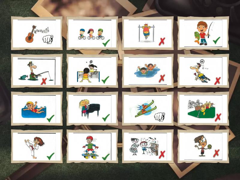 She isn't doing gymnastics now., He is riding a skateboard now., He isn't playing football now., He isn't playing the piano now., I am / I am not skiing now., They aren't swimming now., He isn't working out now., I am/ I am not playing the guitar now., They are biking. / They are riding their bikes., He is fishing., She is doing karate., He isn't playing volleyball., They are playing the piano., They are playing tennis., She is swimming., He isn't fishing.,