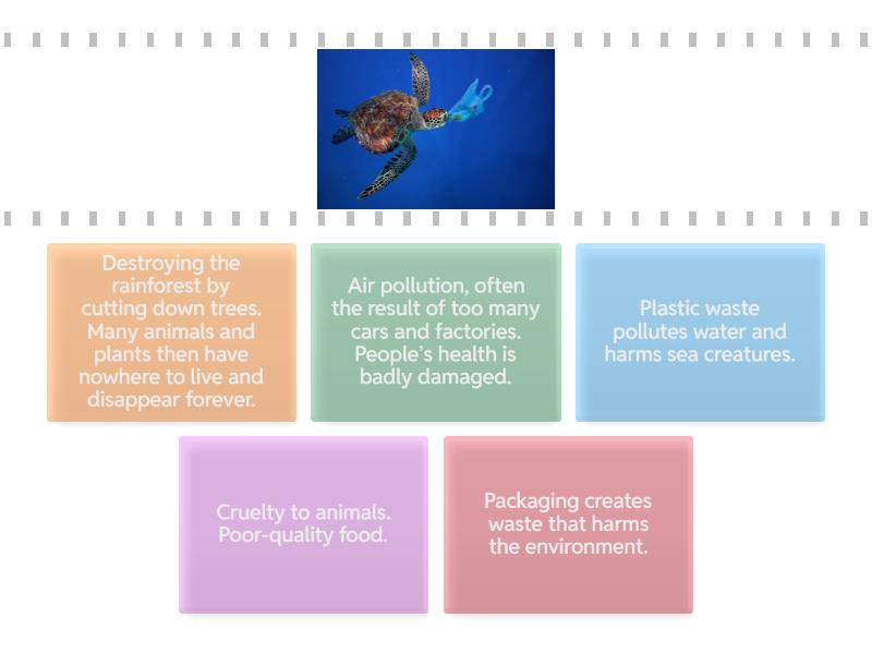 Plastic waste pollutes water and harms sea creatures., Packaging creates waste that harms the environment., Destroying the rainforest by cutting down trees. Many animals and plants then have nowhere to live and disappear forever., Air pollution, often the result of too many cars and factories. People’s health is badly damaged., Cruelty to animals. Poor-quality food.,
