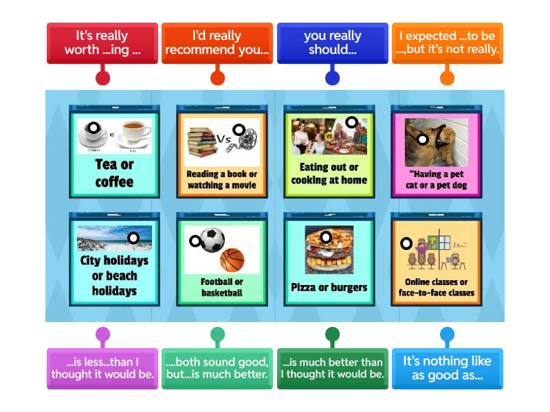 It's nothing like as good as..., It's really worth ...ing ..., I expected ...to be ...,but it's not really., ...is much better than I thought it would be., ...is less...than I thought it would be., you really should..., ....both sound good, but...is much better., I'd really recommend you....