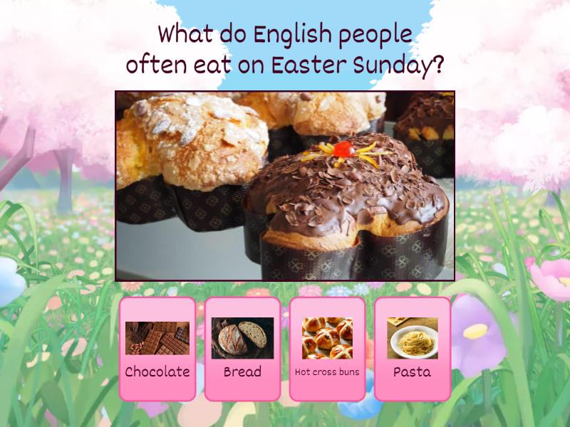 1) What does Easter celebrate? a) Spring b) Harvest c) Resurrection d) New Year 2) What is a common Easter symbol? a) Pumpkin b) Turkey c) Egg d) Star 3) What animal is associated with Easter? a) Rabbit b) Cat c) Dog d) Chick 4) What is an Easter egg hunt? a) A race b) A game c) A dance d) A song 5) What do English people often eat on Easter Sunday? a) Chocolate b) Pasta c) Hot cross buns d) Bread 6) What is Good Friday? a) A festival b) A holiday c) A concert d) A movie 7) What is the Easter Bunny known for? a) Laying eggs b) Delivering eggs c) Singing d) Dancing 8) What is a hot cross bun? a) A cake b) A bread c) A pie d) A cookie 9) When is Easter celebrated? a) 1st April b) 26th March c) every year the date changes 10) What is the most popular Easter activity? a) Visiting family and friends b) going to church c) cooking family meal d) Colouring egss 11) Where did the idea of the Easter bunny come from? a) the USA b) France c) Germany d) the UK