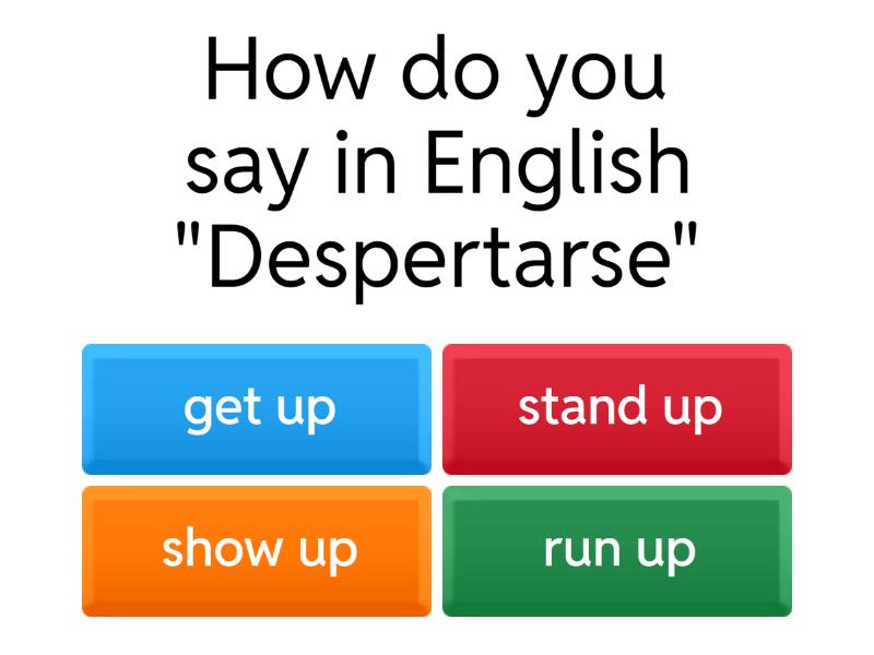 1) How do you say in English "Despertarse" a) get up b) stand up c) show up d) run up 2) Choose 2 daily routines a) Run b) Take a shower c) Brush your teeth d) eat 3) Translate the following word into Spanish "Have dinner" a) Jugar b) almorzar c) cenar d) desayunar 4) Choose true or false " Is this daily routine correct? "PLAYING THE GUITAR" a) TRUE b) FALSE