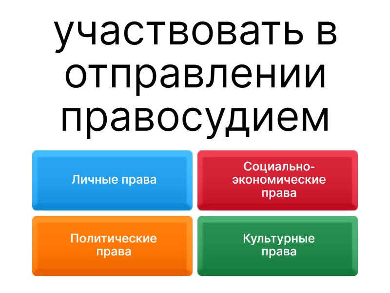 1) участвовать в отправлении правосудием a) Личные права b) Социально- экономические права c) Политические права d) Культурные права 2) обращение в гос учреждения a) Личные права b) Социально- экономические права c) Политические права d) Культурные права 3) на наследство a) Личные права b) Социально- экономические права c) Политические права d) Культурные права 4) доступ к культурным ценностям a) Личные права b) Социально- экономические права c) Политические права d) Культурные права 5) частной собственности a) Личные права b) Социально- экономические права c) Политические права d) Культурные права 6) участие в референдуме a) Личные права b) Социально- экономические права c) Политические права d) Культурные права 7) право на свободу и личную неприкосновенность a) Личные права b) Социально- экономические права c) Политические права d) Культурные права 8) на отдых, досуг a) Личные права b) Социально- экономические права c) Политические права d) Культурные права 9) свобода передвижения a) Личные права b) Социально- экономические права c) Политические права d) Культурные права 10) защита здоровья a) Личные права b) Социально- экономические права c) Политические права d) Культурные права 11) выбор места жительства a) Личные права b) Социально- экономические права c) Политические права d) Культурные права 12) право на достоинство личности a) Личные права b) Социально- экономические права c) Политические права d) Культурные права 13) пассивное избирательное право a) Личные права b) Социально- экономические права c) Политические права d) Культурные права 14) участие в управлении делами государства a) Личные права b) Социально- экономические права c) Политические права d) Культурные права 15) участие в культурной жизни страны a) Личные права b) Социально- экономические права c) Политические права d) Культурные права 16) замена военной службы альтернативной a) Личные права b) Социально- экономические права c) Политические права d) Культурные права 17) право собираться мирно, на митинги, демонстрации шествия a) Личные права b) Социально- экономические права c) Политические права d) Культурные права 18) создание политических объединений a) Личные права b) Социально- экономические права c) Политические права d) Культурные права 19) свобода преподавания a) Личные права b) Социально- экономические права c) Политические права d) Культурные права 20) право на пенсии, пособия, зрп(социальное обеспечение)) a) Личные права b) Социально- экономические права c) Политические права d) Культурные права 21) свобода труда a) Личные права b) Социально- экономические права c) Политические права d) Культурные права 22) предпринимательской деятельности a) Личные права b) Социально- экономические права c) Политические права d) Культурные права 23) право на неприкосновенность частной жизни a) Личные права b) Социально- экономические права c) Политические права d) Культурные права 24) лично и коллективно писать обращения в государственные органы a) Личные права b) Социально- экономические права c) Политические права d) Культурные права 25) свобода слова, совести ,вероисповедания a) Личные права b) Социально- экономические права c) Политические права d) Культурные права 26) политические убеждения a) Личные права b) Социально- экономические права c) Политические права d) Культурные права 27) на жилище a) Личные права b) Социально- экономические права c) Политические прав