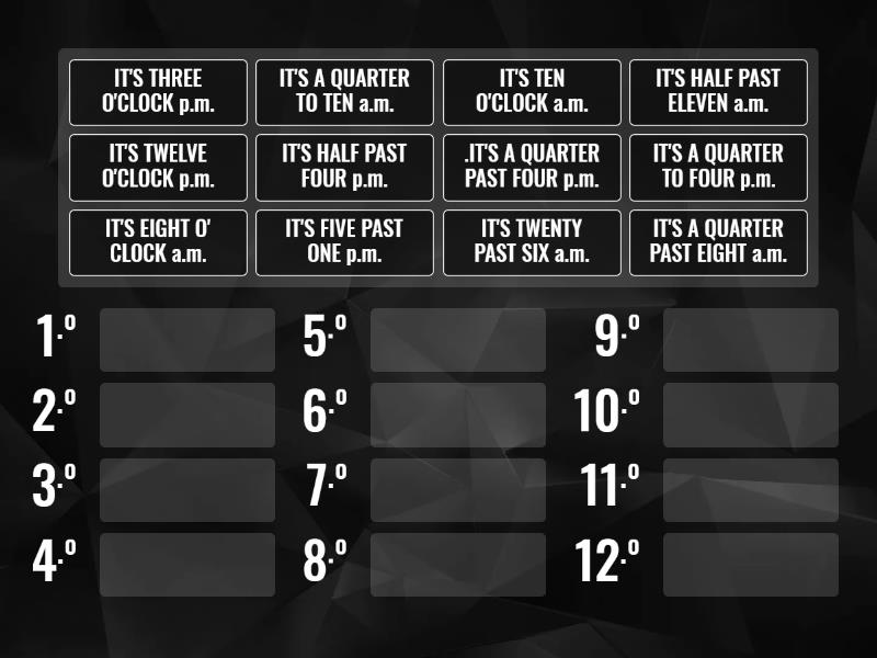 IT'S TWENTY PAST SIX a.m., IT'S EIGHT O' CLOCK a.m., IT'S A QUARTER PAST EIGHT a.m., IT'S A QUARTER TO TEN a.m., IT'S TEN O'CLOCK a.m., IT'S HALF PAST ELEVEN a.m., IT'S TWELVE O'CLOCK p.m., IT'S FIVE PAST ONE p.m., IT'S THREE O'CLOCK p.m., IT'S A QUARTER TO FOUR p.m., IT'S HALF PAST FOUR p.m., .IT'S A QUARTER PAST FOUR p.m..