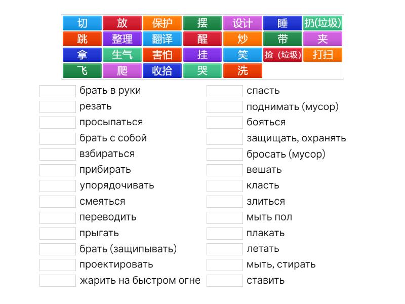 收拾 - прибирать, 整理 - упорядочивать, 洗 - мыть, стирать, 扔(垃圾) - бросать (мусор), 设计 - проектировать, 翻译 - переводить, 保护 - защищать, охранять, 睡 - спасть, 醒 - просыпаться, 打扫 - мыть пол, 切 - резать, 炒 - жарить на быстром огне, 夹 - брать (защипывать), 放 - класть, 挂 - вешать, 摆 - ставить, 笑 - смеяться, 哭 - плакать, 生气 - злиться, 害怕 - бояться, 飞 - летать, 爬 - взбираться, 跳 - прыгать, 拿 - брать в руки, 带 - брать с собой, 捡(垃圾) - поднимать (мусор),