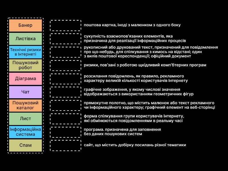 Банер - прямокутне полотно, що містить малюнок або текст рекламного чи інформаційного характеру; графічний елемент на веб-сторінці, Лист - рукописний або друкований текст, призначений для повідомлення про що-небудь, для спілкування з кимось на відстані; один з вилів поштової кореспонденції; офіційний документ, Пошуковий каталог - сайт, що містить добірку посилань різної тематики, Чат - форма спілкування групи користувачів Інтернету, які обмінюються повідомленнями в реальму часі, Технічні ризики в Інтернеті - ризики, пов'зані з роботою щкідливий комп'бтерних програм, Спам - розсилання повідомлень, як правило, рекламного характеру великій кількості користувачів Інтернету, Інформаційна система - сукупність взаємопов'язаних елементів, яка призначина для реалізації інформаційних процесів, Пошуковий робот - програма. призначена для заповнення без даних пошукових систем, Листівка - поштова картка, іноді з малюнком з одного боку, Діаграма - графічне зображення, у якому числові значення відображаються з використанням геометричних фігур,