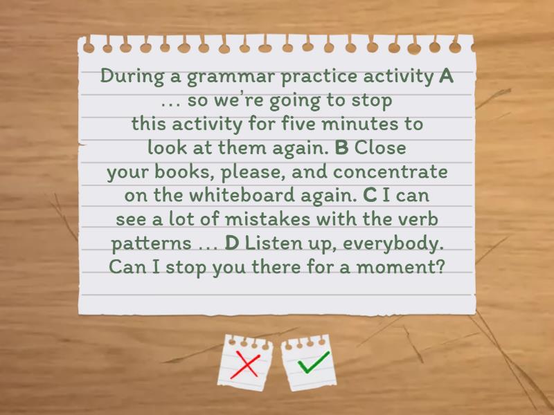 Setting up some vocabulary review A Let’s try the crossword at the bottom of the page. B Open your books at page 9, where we finished working yesterday. C Today we’re going to review some vocabulary. D Work by yourself, but check with a friend if you need to. - C, B, A, D, Setting up controlled speaking practice A Ask your partner the questions and note the answers. B Look at the handout. Can anyone make a wh-question from number one? C Very good. Now you are going to do the same with the other items on the handout. D Turn to face your partner, please. - B, C, D, A, Changing partners for the next stage of the class A … and find the person with the piece of paper that matches your own. B OK? Any questions? Off you go! C Then, sit down together, ready for the next activity. D When I say go, I’d like you to stand up … - D, A, C, B, During a grammar practice activity A … so we’re going to stop this activity for five minutes to look at them again. B Close your books, please, and concentrate on the whiteboard again. C I can see a lot of mistakes with the verb patterns … D Listen up, everybody. Can I stop you there for a moment? - D, C, A, B or D, B, C, A, Teaching reference skills A But before we start, can anyone remember some collocations from recent classes? Good! have fun, have lunch, have the flu. Excellent. B OK, so could one person from each table come and collect the dictionaries, please? We’ll all look at the same example to begin with. C Now, does anyone know how the dictionary shows these collocations? Nobody? D Today we’re going to learn how and where to find collocations in the dictionary. - D, A, C, B, Pre-writing stage in a project A As you listen, I’d like you to write down one memorable fact from Shania’s talk. B Right. Today we’re going to continue talking about pirates. C Who has brought in their internet research on a famous pirate to tell us about? Hands up, please. D Would you like to go first, Shania? Thank you. - B, C, D, A, Setting up a mingle activity A Here’s a handout with the beginnings of some sentences about each of you. Have a look at them first. For example, the first one says: ‘Jenny’s favourite ice-cream flavour is …’ B If you are correct, give yourself a tick. If not, ask a question to find out the correct answer: ‘Jenny, what is your favourite ice-cream flavour?’ C Now, I’d like you to predict the answers. For example, I think Jenny’s favourite ice-cream flavour is chocolate, so I’m going to write chocolate here, in this space. D When you’ve finished filling in all the sentences, stand up and check with each person whether your prediction was correct, like this (models): ‘Hello, Jenny. Is your favourite ice-cream flavour chocolate?’ - A, C, D, B,