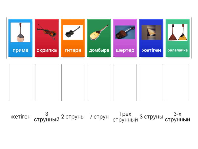 домбыра - 2 струны, жетіген - жетіген, гитара - 7 струн, прима - 3 струнный, шертер - 3-х струнный, скрипка - Трёх струнный, балалайка - 3 струны,