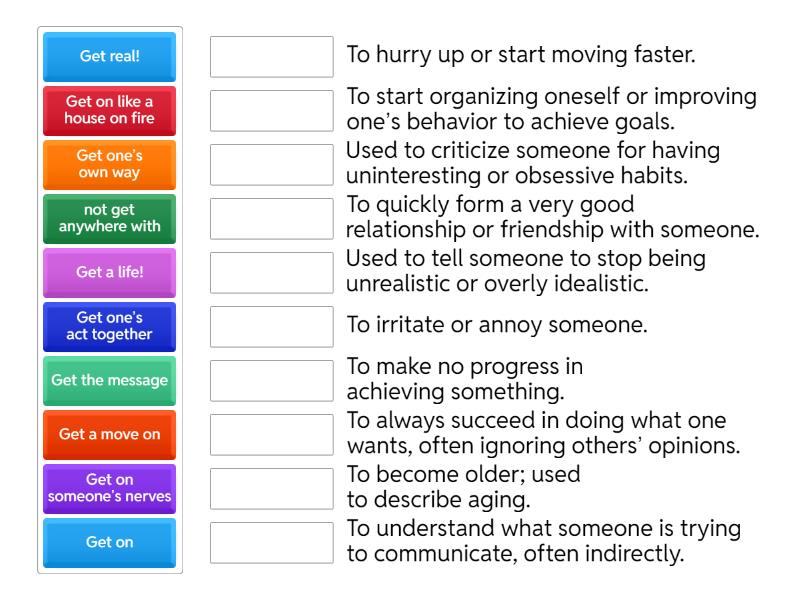 Get real! - Used to tell someone to stop being unrealistic or overly idealistic., Get a life! - Used to criticize someone for having uninteresting or obsessive habits., Get on someone’s nerves - To irritate or annoy someone., Get one’s act together - To start organizing oneself or improving one’s behavior to achieve goals., Get on like a house on fire - To quickly form a very good relationship or friendship with someone., Get a move on - To hurry up or start moving faster., Get on - To become older; used to describe aging., Get the message - To understand what someone is trying to communicate, often indirectly., Get one’s own way - To always succeed in doing what one wants, often ignoring others’ opinions., not get anywhere  with - To make no progress in achieving something.,