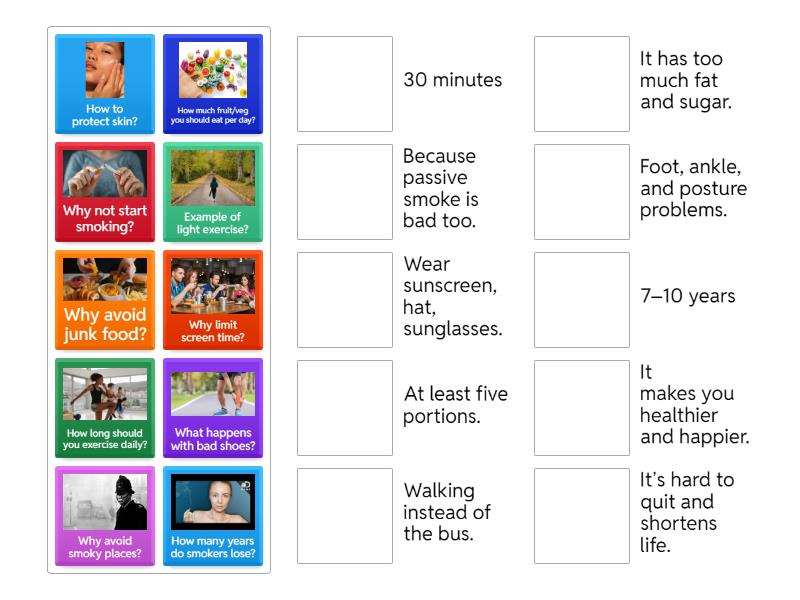 Why limit screen time? - It makes you healthier and happier., How long should you exercise daily? - 30 minutes, Example of light exercise? - Walking instead of the bus., Why avoid junk food? - It has too much fat and sugar., How much fruit/veg you should eat per day? - At least five portions., Why not start smoking? - It’s hard to quit and shortens life., How many years do smokers lose? - 7–10 years, Why avoid smoky places? - Because passive smoke is bad too., How to protect skin? - Wear sunscreen, hat, sunglasses., What happens with bad shoes? - Foot, ankle, and posture problems.,