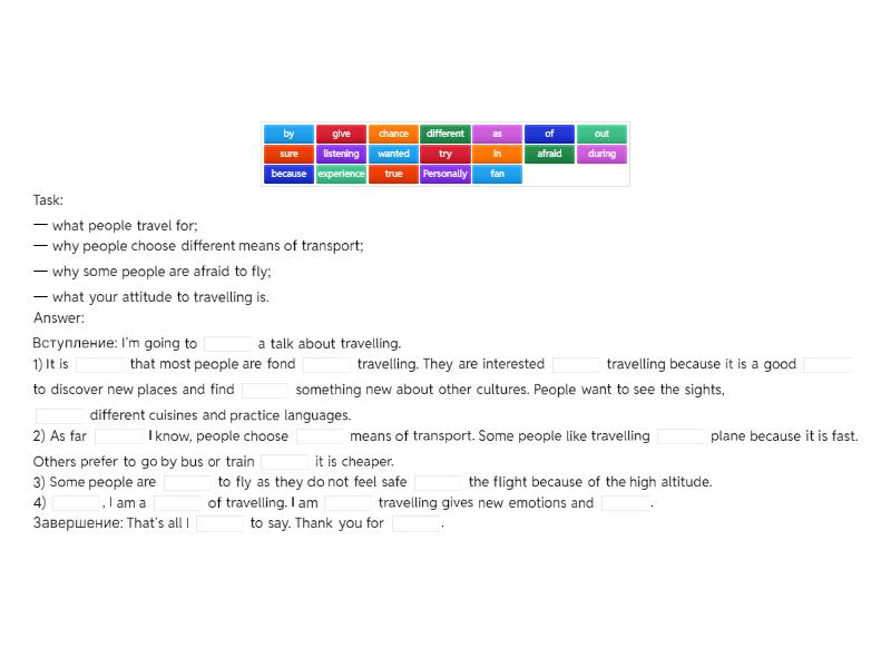 Task: — what people travel for; — why people choose different means of transport; — why some people are afraid to fly; — what your attitude to travelling is. Answer: Вступление: I’m going to ____ a talk about travelling. 1) It is ____ that most people are fond ____ travelling. They are interested ____ travelling because it is a good ____ to discover new places and find ____ something new about other cultures. People want to see the sights, ____ different cuisines and practice languages. 2) As far ____ I know, people choose ____ means of transport. Some people like travelling ____ plane because it is fast. Others prefer to go by bus or train ____ it is cheaper. 3) Some people are ____ to fly as they do not feel safe ____ the flight because of the high altitude. 4) ____, I am a ____ of travelling. I am ____ travelling gives new emotions and ____. Завершение: That’s all I ____ to say. Thank you for ____.