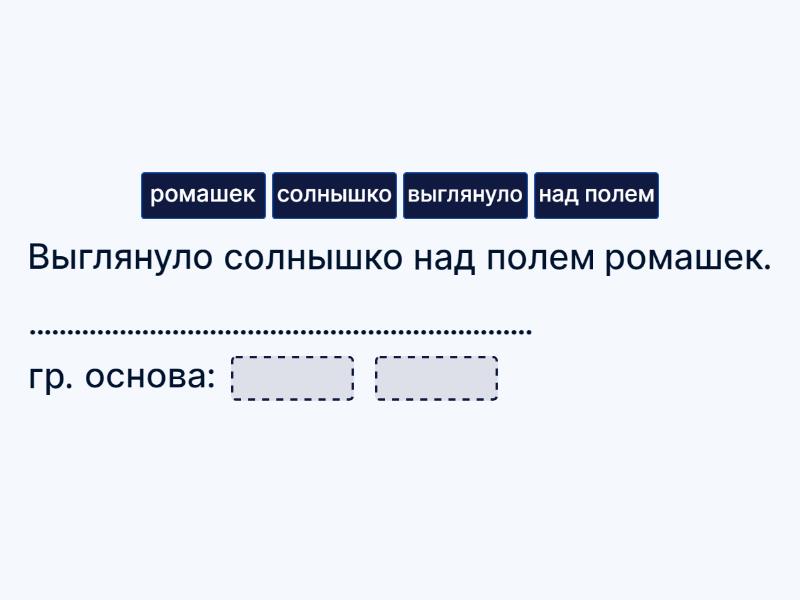 Выглянуло солнышко над полем ромашек. ................................................................... гр. основа: ____ ____ Лохматый пёс Шарик лает на луну. ................................................................... гр. основа: ____ ____ Белый кот Барсик громко мяукает на птичек. ................................................................... гр. основа: ____ ____ Я и сестра гуляем по парку вдвоём. ................................................................... гр. основа: ____ и ____ ____ Мы громко пели и долго танцевали вчера на концерте в школе. ................................................................... гр. основа: ____ ____ и ____ Бабушка и мама приготовили для меня подарок с утра. ................................................................... гр. основа: ____ и ____ ____ Хищная сова охотится ночью за мышками. ................................................................... гр. основа: ____ ____ Утром и вечером я учил стихотворение с мамой. ................................................................... гр. основа: ____ ____ Я люблю рисовать закаты. ................................................... гр. основа: ____ ____