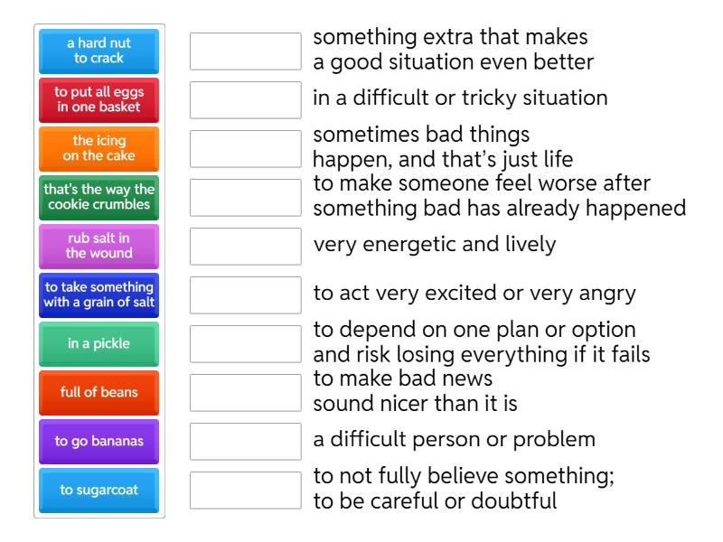 to put all eggs in one basket - to depend on one plan or option and risk losing everything if it fails, a hard nut to crack - a difficult person or problem, to take something with a grain of salt - to not fully believe something; to be careful or doubtful, that's the way the cookie crumbles - sometimes bad things happen, and that’s just life, to go bananas - to act very excited or very angry, to sugarcoat - to make bad news sound nicer than it is, the icing on the cake - something extra that makes a good situation even better, full of beans - very energetic and lively, in a pickle - in a difficult or tricky situation, rub salt in the wound - to make someone feel worse after something bad has already happened,