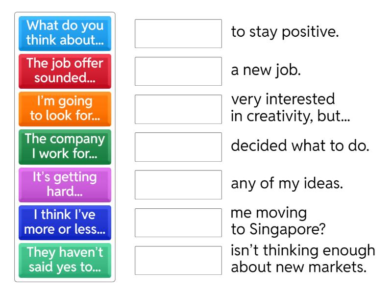 I’m going to look for... - a new job., They haven’t said yes to... - any of my ideas., What do you think about... - me moving to Singapore?, The job offer sounded... - very interested in creativity, but..., The company I work for... - isn’t thinking enough about new markets., I think I’ve more or less... - decided what to do., It’s getting hard... - to stay positive.,