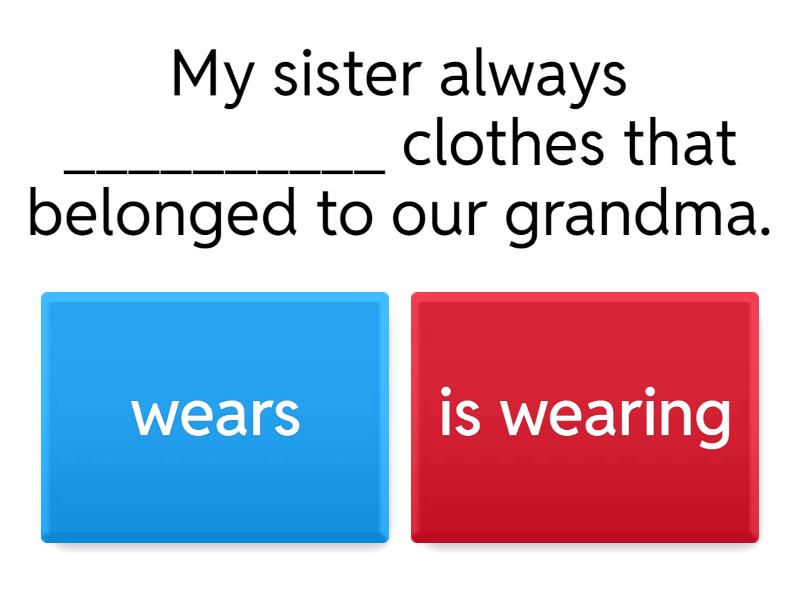 1) My sister always __________ clothes that belonged to our grandma. a) wears b) is wearing 2) Look! She __________ a jacket that looks really cool. a) wears b) is wearing 3) I usually __________ things that are not worth a lot, but I love them. a) buy b) am buying 4) Right now, I __________ an old photo album that I inherited from my grandfather. a) look at b) am looking at 5) My dad often __________ shoes made of leather. a) wears b) is wearing 6) Wait a second – he __________ that old, damaged bag again! a) carries b) is carrying 7) She never __________ fake jewelry. She likes genuine things. a) wears b) is wearing 8) He __________ about his guitar a lot. It’s really special to him. a) talks b) is talking