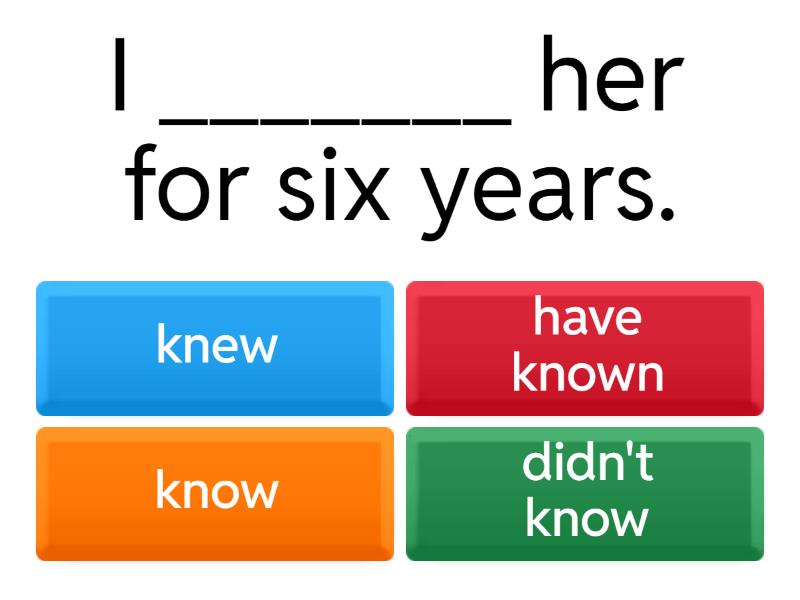 1) I _______ her for six years. a) knew b) have known c) know d) didn't know 2) I _______ Pete last night. a) didn't see b) saw c) have seen d) have not seen 3) He _______ in Paris from 1997 to 2000. a) have lived b) have not lived c) lived d) lives 4) They ________ some postcards. a) have just bought b) have just buyed c) just bought d) just buy 5) I'm really hungry. I ________ since last night. a) has eaten b) ate c) didn't eat d) have not eaten 6) We _________ a taxi to town in the morning. a) have not taken b) took c) take d) have taken 7) I ______ my job three times this year. a) changed b) changes c) have changed d) did not change 8) A car came round the corner and I ______ out of the way. a) jumped b) was jumped c) have not jumped d) have jumped 9) I ______ on the ship before. a) have was b) did not been c) was d) have been 10) Tom Hanks ______ an Oscar several times already. a) won b) has won c) has winnen d) did not win