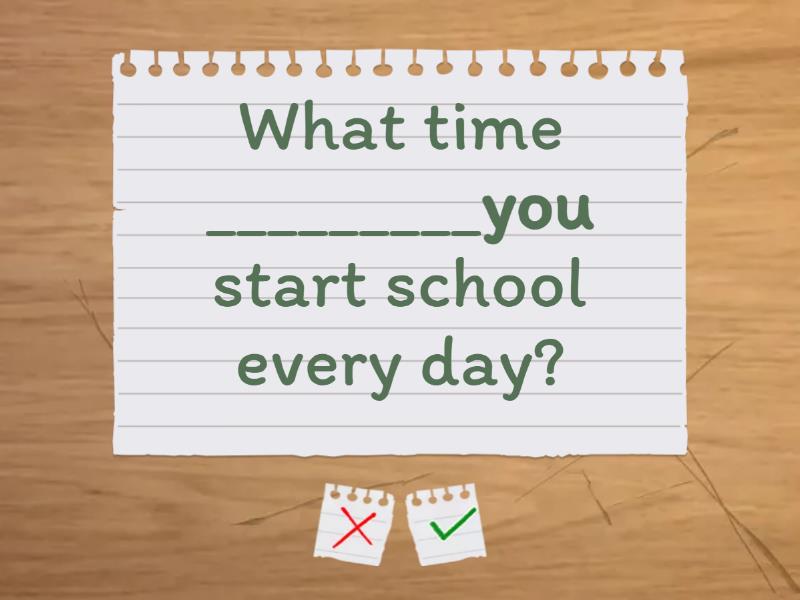 What time _________you start school every day? - do, Peter, what ______you doing? - are, How long _________it take you to get home? - does, Look! He _________running in the street. - is, When _________the film start? - does, When _______your birthday? - is, How ________your father get to work? - does, When _______your sister feed the cat? - does, ______you having fun right now? - Are,