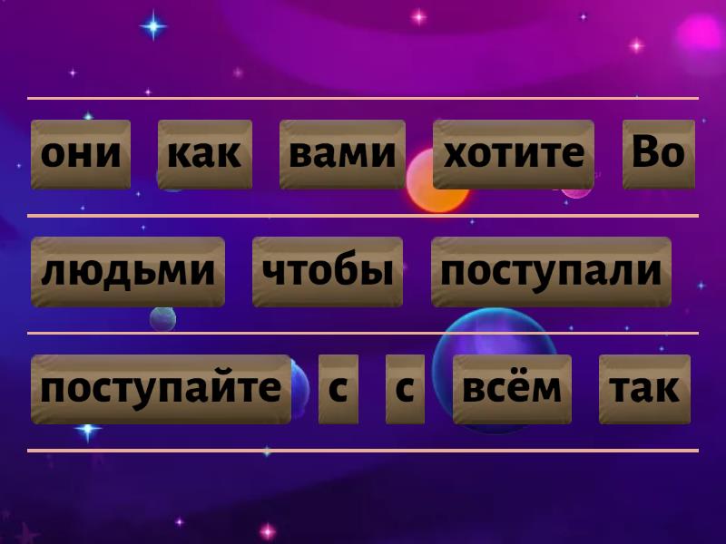 Во всём поступайте с людьми так как хотите чтобы они поступали с вами, Просите и вам будет дано ищите и найдёте , По всей земле будет проповедана радостная весть о Царстве , Из-за роста беззакония любовь большинства людей остынет, Но тот кто выстоит до конца спасётся ,
