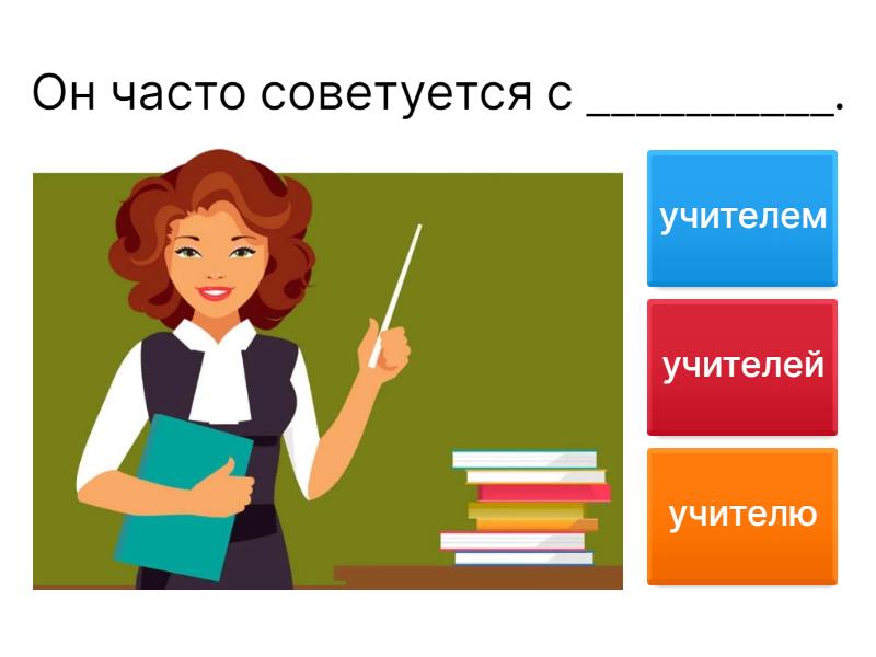 1) Он часто советуется с __________. a) учителем b) учителей c) учителю 2) Я ходил на обед с ______________. a) другом b) другой c) друга 3) Он пойдёт завтра гулять с ________________. a) собакеем b) собаком c) собакой 4) Вчера мы ходили в кино с _____________. a) девушке b) девушкой c) девушкей 5) В понедельник вы должны пойти с __________. a) нам b) нами c) наш 6) Недавно мы ездили с ___________ в Сочи. a) братой b) брат c) братом 7) Летом мы обычно ездим с ___________ на дачу. a) сестрой b) сестре c) сестрей 8) Я недавно встречалась с _____________. a) отцу b) отцом c) отцем 9) Он недавно познакомился с ______________. a) певицой b) певице c) певицей 10) Я люблю обсуждать фильмы с _________________. a) Александрем b) Александром c) Александру