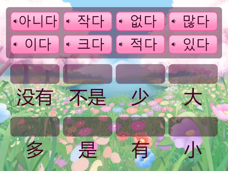 있다 - 有, 없다 - 没有, 많다 - 多, 적다 - 少, 크다 - 大, 작다 - 小, 이다 - 是, 아니다 - 不是,
