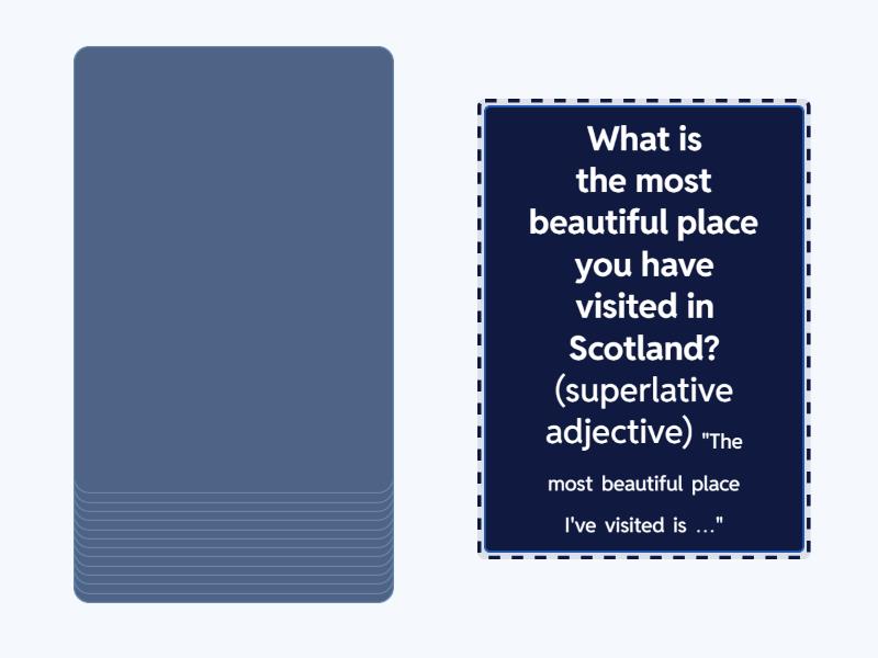 What were you doing at 7pm last night? (Past Continuous) "At 7pm last night I was …", What were you wearing at the last wedding you went to? (Past Continuous) "At the last wedding I went to, I was …", What was the weather like when you were travelling to college this morning? (Past Continuous) "When I was travelling to college this morning.....…", What are you going to do this summer? (Future: going to) "I'm going to …, What are you going to do for your birthday this year? (Future: going to) "I'm going to …, Will you do any work or voluntary work this summer? (Future: will) "I will / won't … this summer.", What is the most delicious food you have ever eaten? (superlative adjective) "The most.…", What is the most beautiful place you have visited in Scotland? (superlative adjective) "The most beautiful place I've visited is …", Have you ever volunteered before? "I have..., Have you ever had a pet? (Present perfect) "I have..., What will you eat if you go to a restaurant tonight? (1st Conditional) "If I …", If you had a million pounds, what would you do? (2nd Conditional) "If I ....", If you could live in the year 1800 or in the year 2200, which would you choose? (2nd Conditional) "If…" , If you were lost in a forest at midnight with no phone, what would you do? (2nd Conditional) "If ...…".