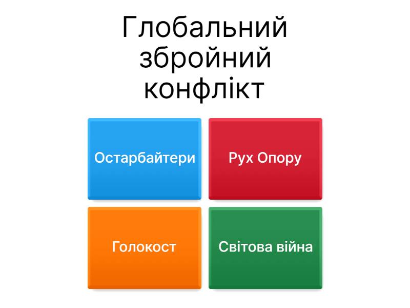1) Глобальний збройний конфлікт a) Остарбайтери b) Рух Опору c) Голокост d) Світова війна 2) Систематичне винищення євреїв на окупованих нацистською Німеччиною територіях a) Партизани b) Колабораціонізм c) Світова війна d) Голокост 3) Організований опір німецької окупації під час ДСВ  a) Східний вал b) Депортація c) План Барбаросса d) Рух Опору 4) Назва добровільних недержавних, військових об'єднань  a) Партизани b) План Барбаросса c) Світова війна d) Випалена земля 5) Т план уряду Третього Рейху з проведення освоєння земель Східної Європи та її німецької колонізації після перемоги над СРСР a) План Барбаросса b) План Ост c) Світова війна d) Остарбайтери 6) Стратегічна наступальна операція збройних сил Німеччини та її союзників проти СРСР a) Світова війна b) План Ост c) Партизани d) План Барбаросса 7) Її метою було повністю знищити наявну інфраструктуру перед наступаючим ворогом.  a) Остарбайтери b) Рух Опору c) Випалена земля d) План Ост 8) Особи, які вивозилися гітлерівцями з окупованих територій, на примусові роботи до Німеччини. a) Партизани b) Колабораціонізм c) Остарбайтери d) Світова війна 9) Примусове переселення, вигнання чи висилка з постійного місця проживання або з держави окремих осіб чи народів.  a) План Барбаросса b) Депортація c) Колабораціонізм d) Східний вал 10) Оборонна лінія, частково збудована німецько-нацистськими військами у 1943 році на Східному фронті a) Східний вал b) Колабораціонізм c) Партизани d) Світова війна 11) Співпраця населення чи громадян держави з ворогом на користь ворога-загарбника  a) Остарбайтери b) Депортація c) План Барбаросса d) Колабораціонізм
