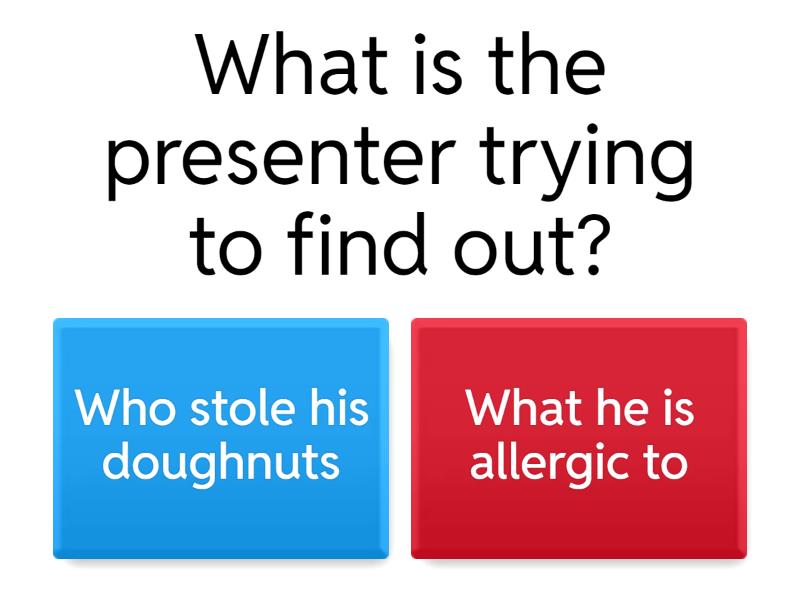 1) What is the presenter trying to find out? a) Who stole his doughnuts b) What he is allergic to 2) What cluses have been left behind that he can use? a) Some sugar b) A note written in pen on a pieces of kitchen towel c) A bit of jam d) Some fingerprints 3) What does he do with the pens? a) Dips them in water b) Looks at the ink inside c) Makes a mark on a kitchen towel with each pen 4) Where does he put the pieces of paper? a) In the bin b) Dips the end in water c) Puts them under the water d) Mixes them with the pens 5) Explain how the patterns help him to find who stole the doughnuts a) Match the pattern to the pattern created by the pen that was used to write the note b) Check what colour the ink is