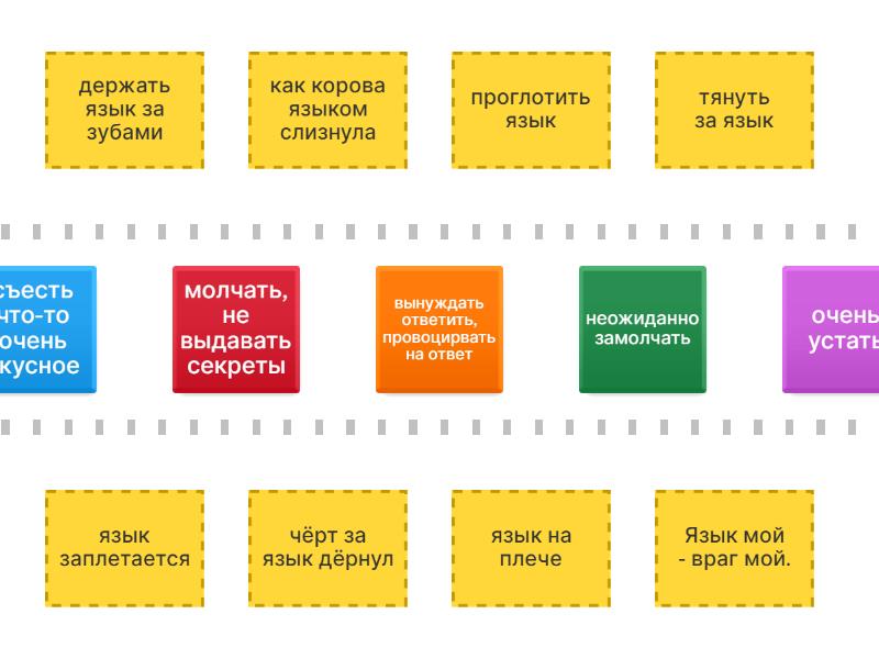 держать язык за зубами: молчать, не выдавать секреты, как корова языком слизнула: как сквозь землю провалиться, проглотить язык: неожиданно замолчать, съесть что-то очень вкусное, тянуть за язык: вынуждать ответить, провоцирвать на ответ, язык заплетается: утрачивается способность говорить ясно, чёрт за язык дёрнул: сказать что-то неуместное, напрасно, язык на плече: очень устать, Язык мой - враг мой.: говорить лишнее во вред себе,