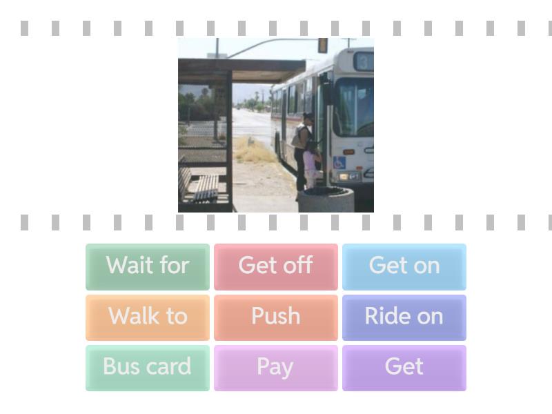 Get on , Get off, Walk to, Wait for, Pay, Ride on, Bus card, Push, Get ,