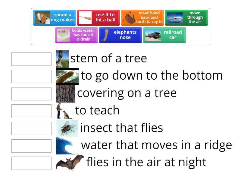 use it to hit a ball - flies in the air at night, elephants nose - stem of a tree, railroad car - to teach, sound a dog makes - covering on a tree, move hand back and forth to say hi - water that moves in a ridge, move through the air - insect that flies, holds water, has faucet & drain - to go down to the bottom,