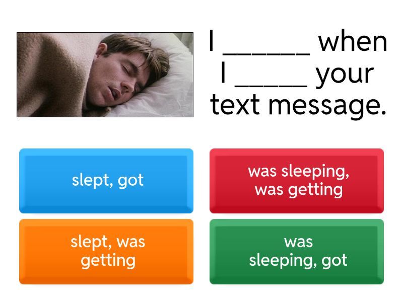 1) I ______ when I _____ your text message. a) slept, got b) was sleeping, was getting c) slept, was getting d) was sleeping, got 2) Susan ____ around Italy when she ____ her boyfriend. a) travelled, was meeting b) was travelling, met c) travelled, met d) was travelling, was meeting 3) When we ____ the house, we ___ some old photos. a) cleaned, found b) were cleaning, were finding c) were cleaning, found d) cleaned, were finding 4) They ____ for the bus when they ___ an accident. a) waited, saw b) were waiting, saw c) were waiting, were seeing d) waited, were seeing 5) It _____ to rain when they ___ to school. a) started, were cycling b) was starting, cycled c) was starting, were cycling d) started, cycled 6) A dog ____ into the road when I ____ home. a) was running, was driving b) ran, drove c) was running, drove d) ran, was driving
