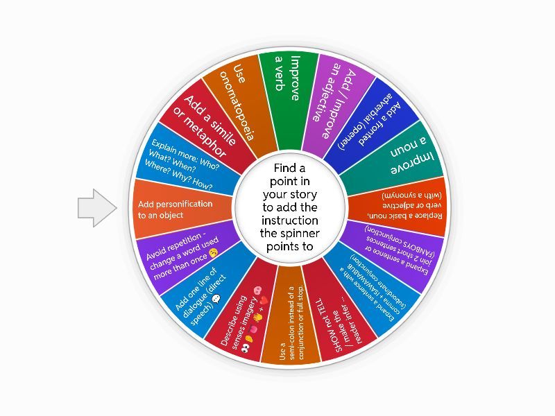 1) Explain more: Who? What? When? Where? Why? How? 2) Add a simile or metaphor 3) Use onomatopoeia 4) Improve a verb 5) Add / Improve an adjective 6) Add a fronted adverbial (opener) 7) Improve a noun 8) Replace a basic noun, verb or adjective (with a synonym) 9) Expand a sentence or join 2 short sentences (FANBOYS conjunction) 10) Expand a sentence with a comma + ISAWAWABUB (subordinate conjunction) 11) SHOW not TELL / make the reader infer ... 12) Use a semi-colon instead of a conjunction or full stop. 13) Describe using senses imagery 🐽 👀👂👅 👋 + ❤️ 14) Add one line of dialogue (direct speech) 💬 15) Avoid repetition - change a word used more than once 🥱 16) Add personification to an object