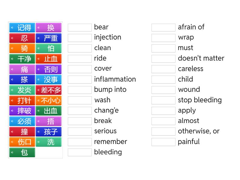 捂 - cover, 摔破 - break, 骑 - ride, 不小心 - careless, 撞 - bump into, 出血 - bleeding, 伤口 - wound, 严重 - serious, 止血 - stop bleeding, 洗 - wash, 干净 - clean, 搽 - apply, 包 - wrap, 没事 - doesn't matter, 痛 - painful, 忍 - bear, 差不多 - almost, 打针 - injection, 怕 - afrain of, 必须 - must, 否则 - otherwise, or, 发炎 - inflammation, 孩子 - child, 记得 - remember, 换 - chang'e,