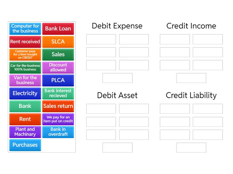 Debit Expense: Rent, Sales return, Discount allowed, Purchases , Electricity, Credit Income: Sales, Bank interest recieved, Rent received, Debit Asset: Bank, Computer for the business, Car for the business 100% business, Van for the business, Plant and Machinary, SLCA, We pay for an item put on credit , Credit Liability: Bank in overdraft, Bank Loan , PLCA , Customer pays for a item bought on CREDIT,